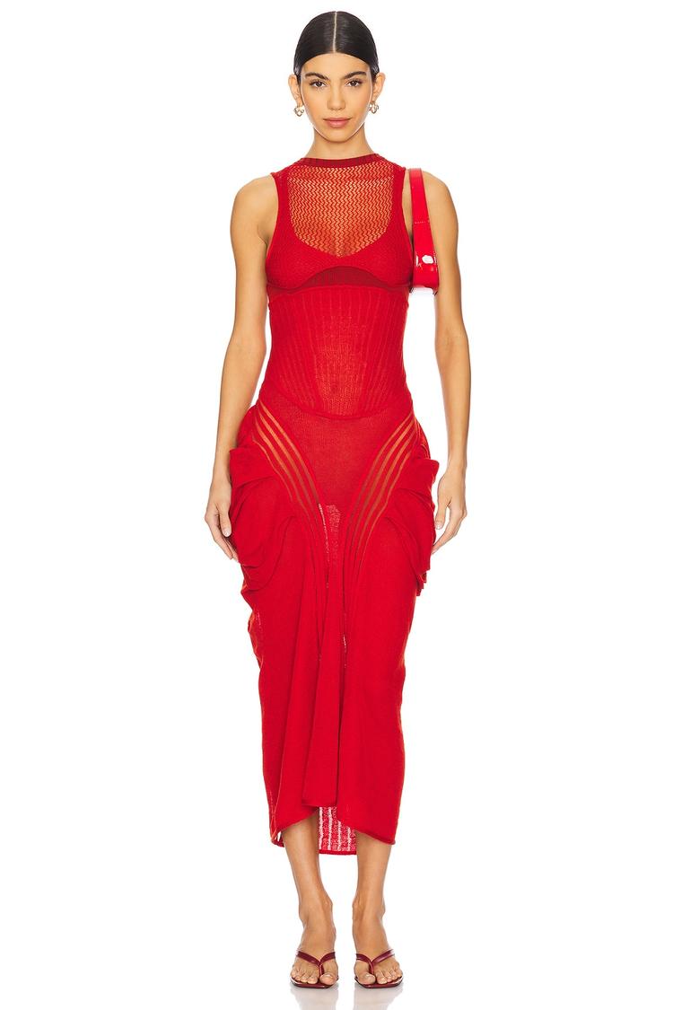 A striking red maxi dress crafted from lightweight rayon knit features a sleek column silhouette with a round neckline and wide straps. The semi-sheer fabric and draped accents at the hips create a sexy, modern look, complemented by a keyhole cut-out back detail. Its slim fit and pull-on styling offer effortless elegance for spring and summer occasions. Ideal for brunch, date nights, or evening outings, this dress promises both comfort and standout style with its sheer texture and sophisticated draping.
