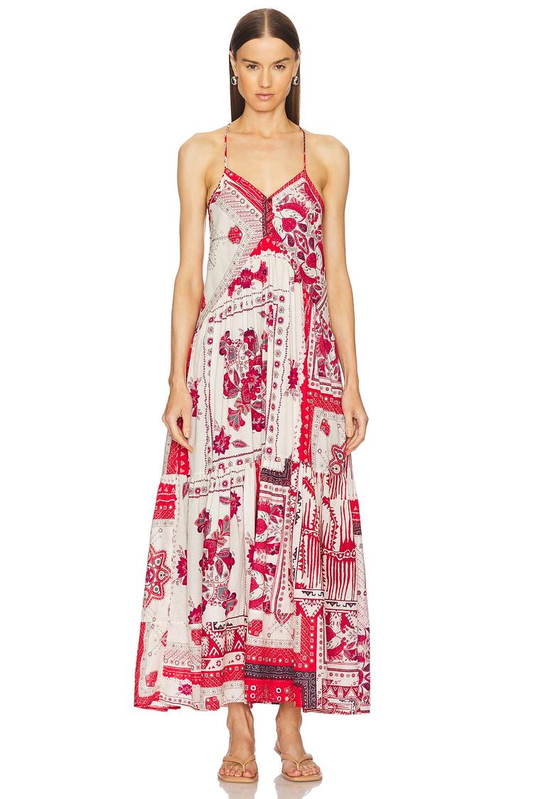 Lightweight cotton fabric and a flowing maxi silhouette define this bohemian-inspired slip dress. Featuring a patchwork floral print in vibrant red and white, the dress is fully lined and designed with delicate spaghetti straps and a flattering V-neckline. The front button accents add subtle detail while maintaining easy pullover styling. Ideal for warm spring and summer days, it suits casual outings, brunch dates, or vacation getaways with effortless charm and comfort.