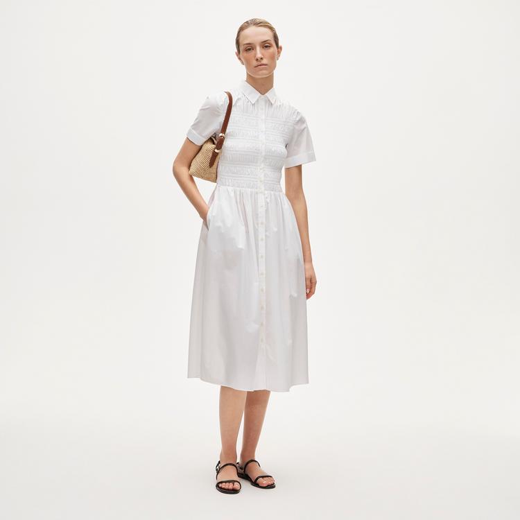 Soft white cotton poplin shapes this midi-length shirt dress featuring classic collar and half sleeves for an effortlessly polished look. The bodice is enhanced with delicate smocking details that add texture and subtle sophistication. Its regular fit and button-front closure offer comfort and easy wear, making it a versatile choice for casual days, brunches, or workwear during spring and summer. The clean hemline and covered back complete this timeless piece, perfect for those who appreciate classic style with a chic, modern twist.