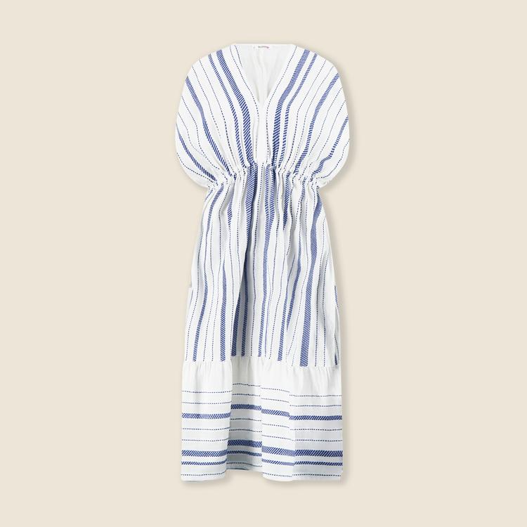 Soft cotton fabric and a relaxed wrap silhouette define this midi dress with a plunging neckline and flutter sleeves featuring delicate ruffle details. The blue and white striped pattern adds a fresh, classic vibe while side slits enhance movement and comfort. Ideal for spring and summer, this versatile dress transitions seamlessly from casual brunches to vacation outings and everyday wear. The clean hemline and covered back complete the effortless look, making it a timeless staple for a chic, laid-back style.