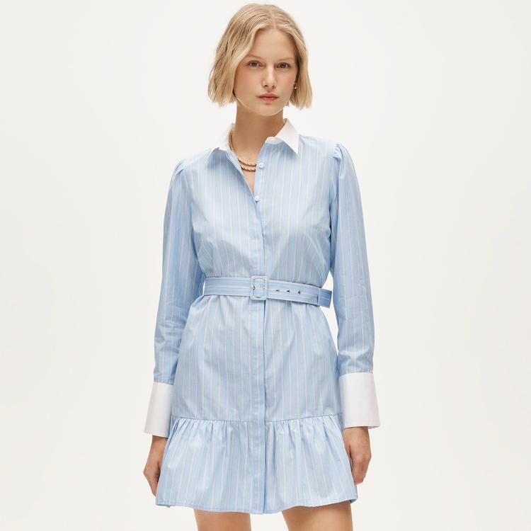 Soft striped cotton poplin shapes this classic shirt dress with a fresh, preppy vibe. The mini length and ruffled hem add a playful tiered detail, while the belted waist defines the silhouette for a flattering fit. Long sleeves with contrasting white cuffs and a crisp collar enhance its polished look. Ideal for casual days, brunches, or workwear, this versatile dress brings timeless charm and breathable comfort to your seasonal wardrobe.