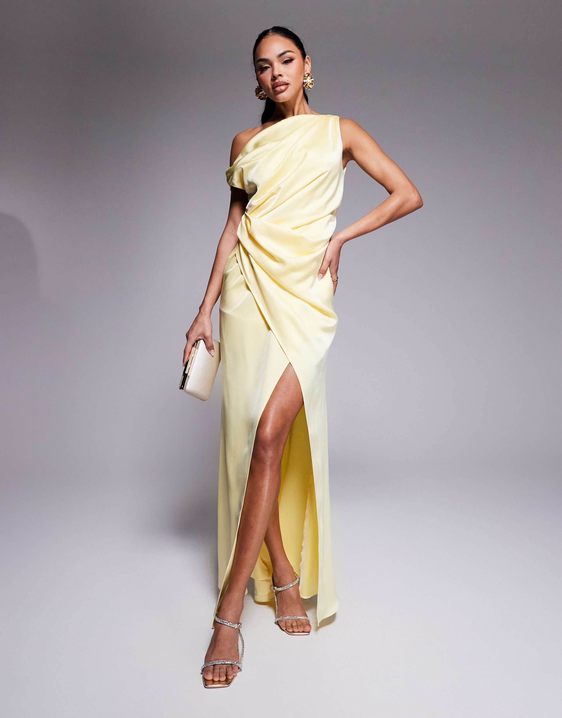 Step into elegance with this stunning light yellow satin sheath dress, designed to accentuate your silhouette with its unique asymmetric neckline and draped detailing. The sumptuous fabric flows gracefully to a maxi length, while the daring high slit adds a touch of allure, making it perfect for formal occasions and romantic date nights. Whether you’re attending a cocktail party or a spring wedding, this dress embodies modern glamour while ensuring you stand out. Elevate your evening look with this captivating piece that speaks of sophistication and charm.