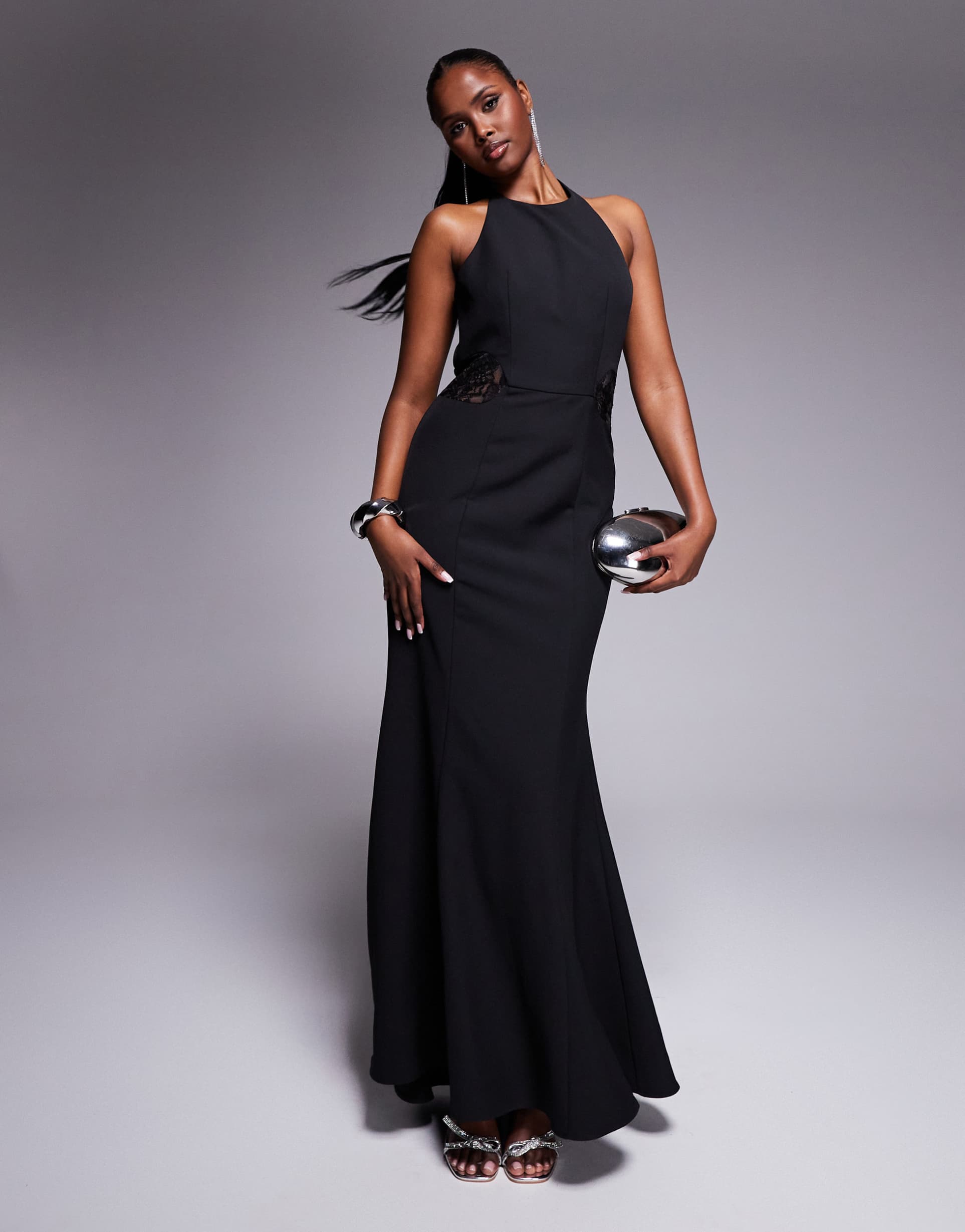 JARLO HIGH NECK FISHTAIL MAXI DRESS WITH LACE PANELS IN BLACK