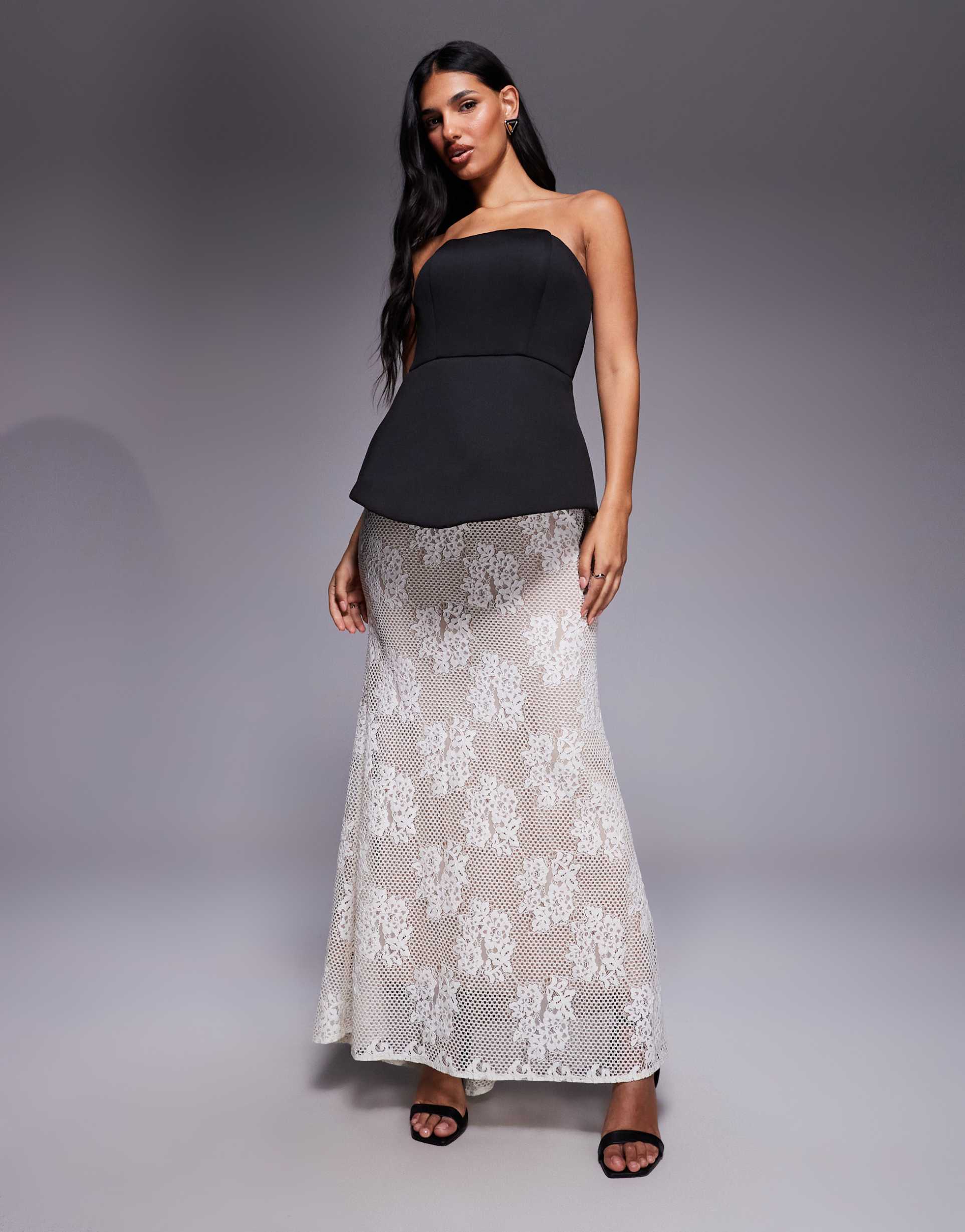 JARLO PIP STRUCTURED STRAPLESS MAXI DRESS WITH CONTRAST LACE SKIRT IN BLACK AND WHITE