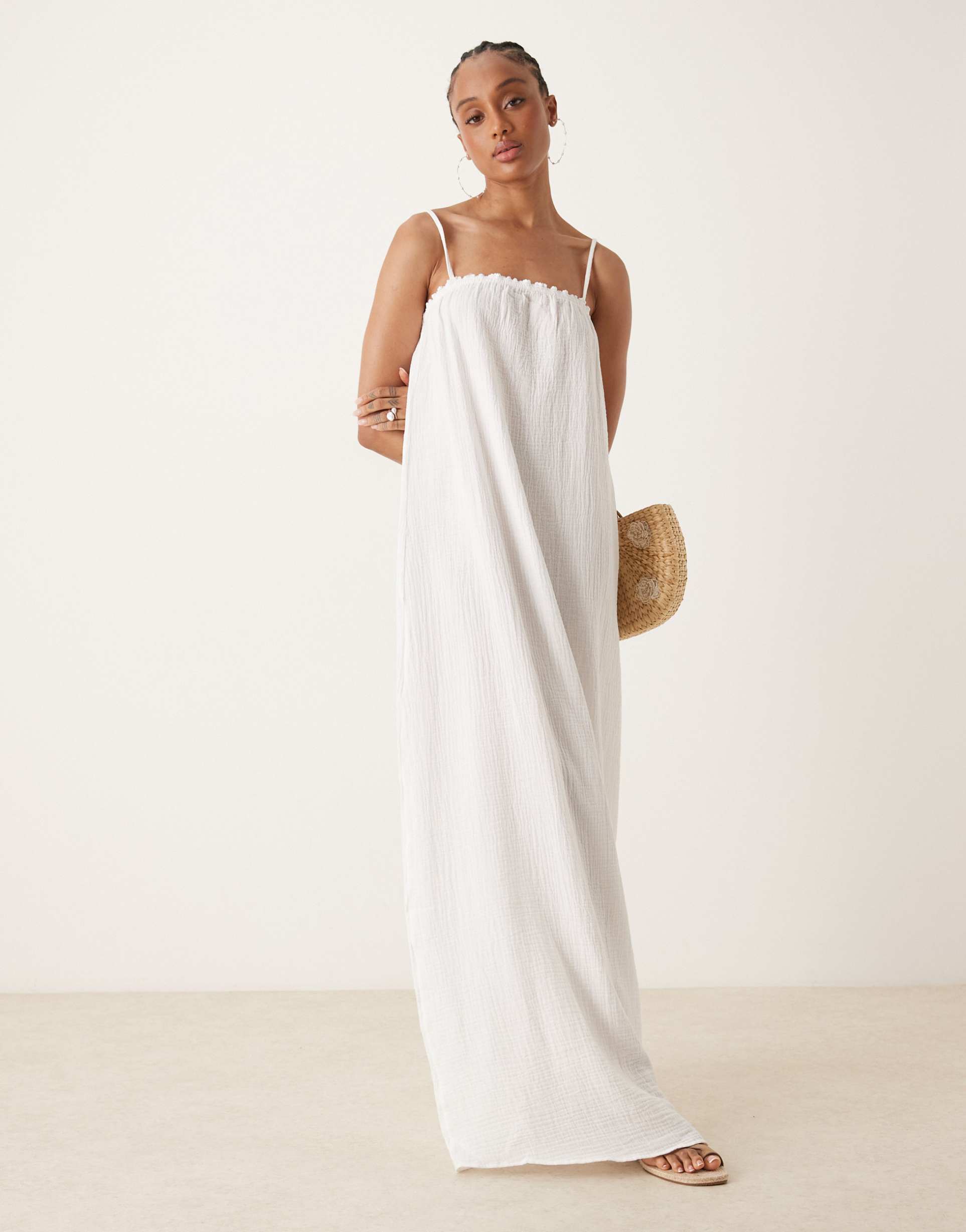Soft off-white cotton with a textured finish creates an effortlessly breezy maxi dress perfect for warmer days. The square neckline and sleeveless design offer a minimalist yet chic silhouette, complemented by delicate lace trim along the hem. Its regular fit and adjustable straps ensure comfortable wear for everyday outings, vacation escapes, or casual brunches. Designed in a tall size for added length, this dress combines simplicity with subtle detailing for versatile summer style.