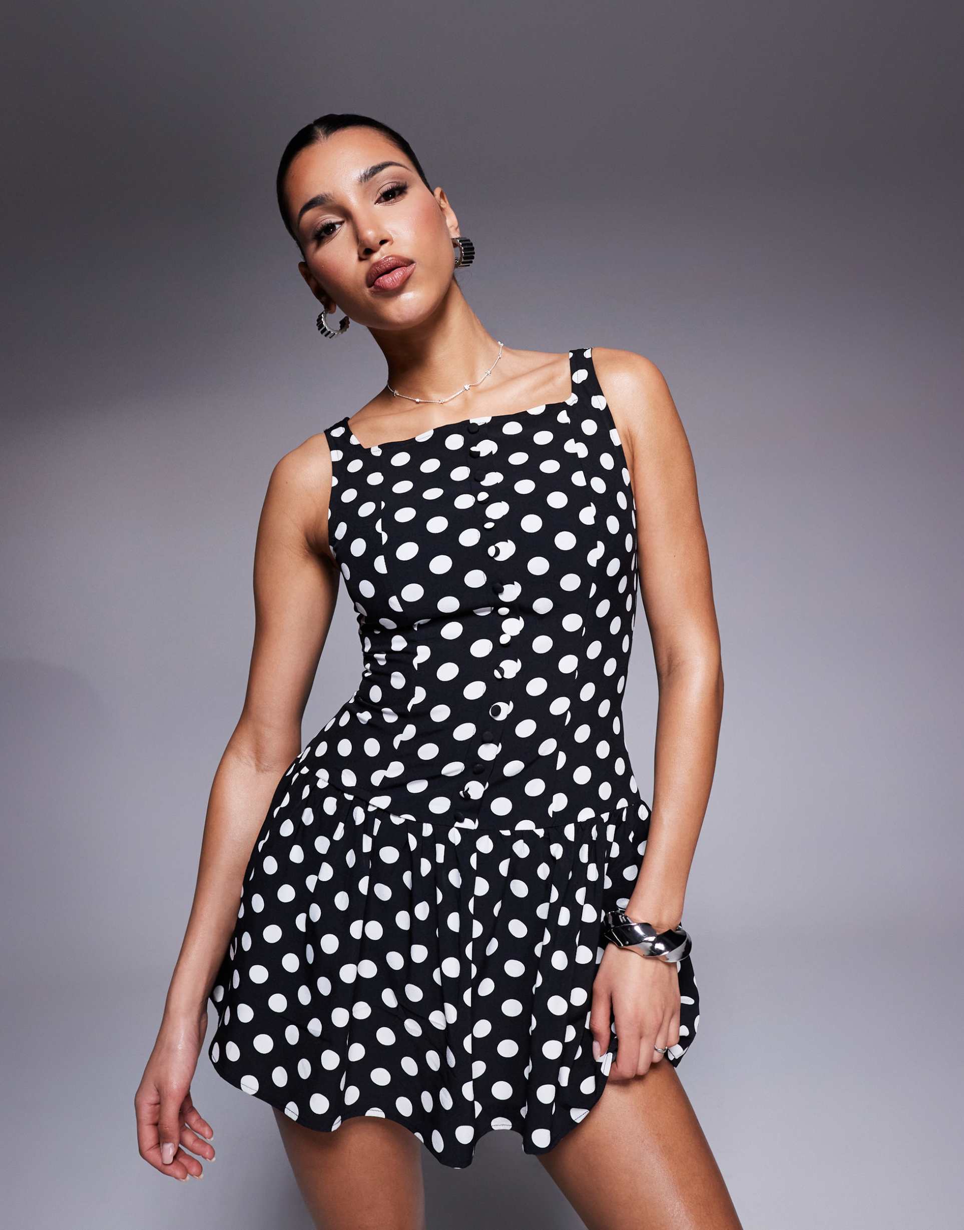 A playful black mini dress adorned with classic white polka dots offers a timeless appeal. Its square neckline and fixed wide straps create a balanced silhouette, while the button front placket adds a subtle design detail that enhances its casual charm. Crafted from smooth polyester fabric, this regular fit dress features a dropped waist with a ruffled hem that adds flirty movement. Perfect for spring and summer outings, it suits casual days, brunches, and date nights with effortless style.