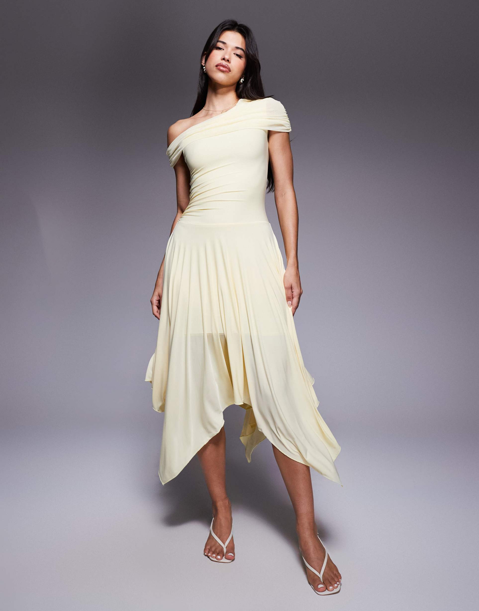 Soft and stretchy polyester-elastane fabric sculpts a sleek silhouette with a fitted waist and asymmetric neckline. The midi-length dress features delicate draping at the handkerchief hem, offering fluid movement and modern elegance. Short regular sleeves complement the minimalist design, making it a sophisticated choice for spring and summer occasions like cocktail parties, date nights, and night outs. Its chic matte yellow tone adds a fresh pop of color for refined, contemporary style.