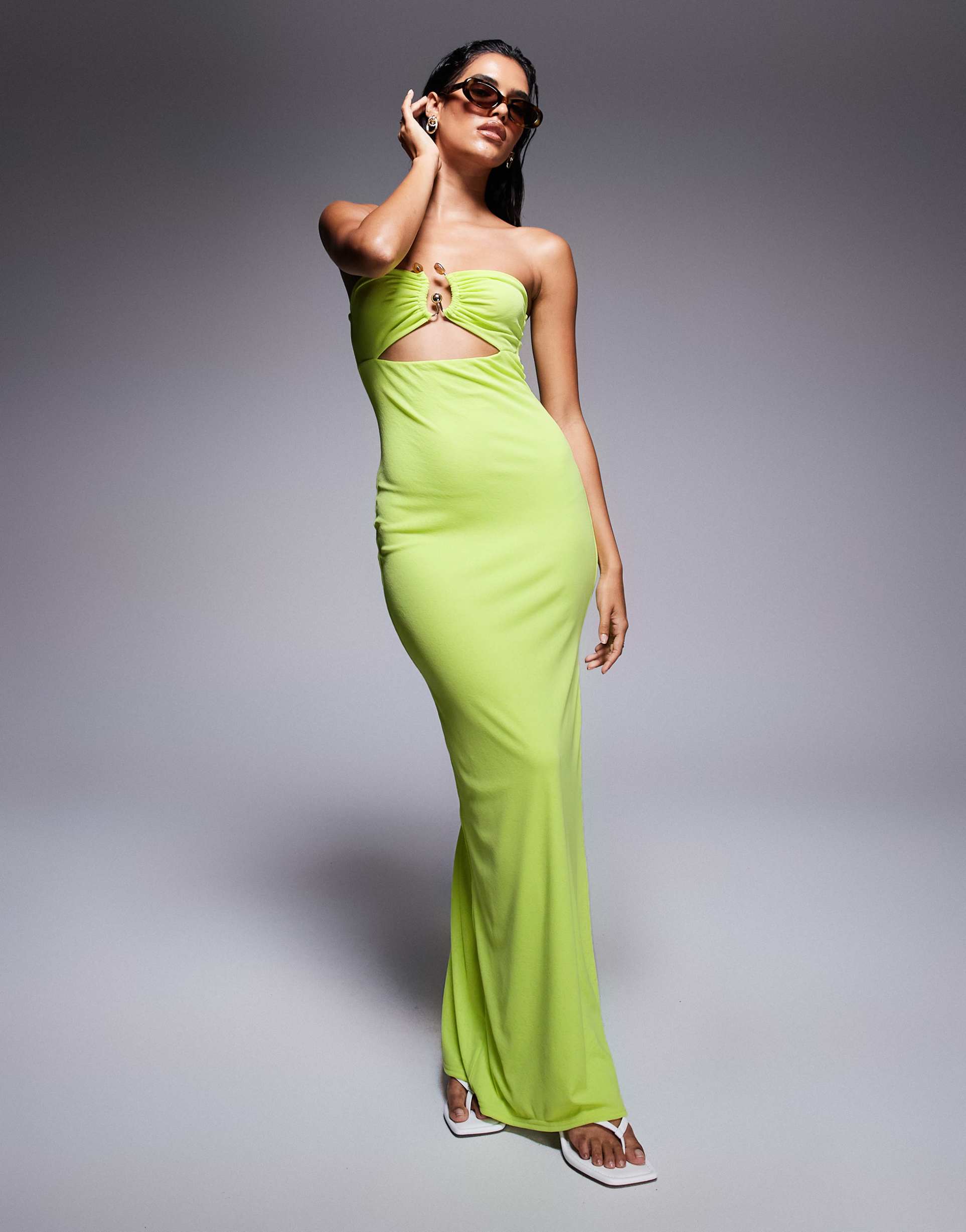 KAIIA EXCLUSIVE DOUBLE LAYERED SLINKY BANDEAU GOLD HARDWARE BUST DETAIL THIGH SLIT MAXI DRESS IN LIME GREEN