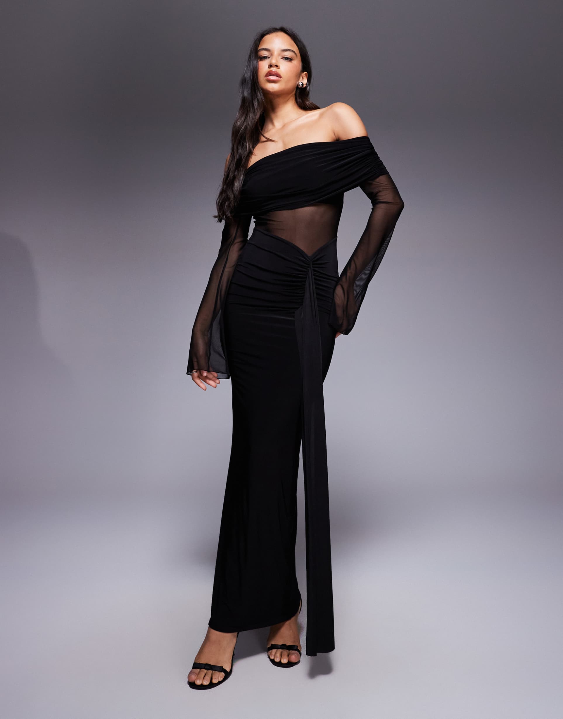 Softly draping off-shoulder sleeves and sheer panels create a striking silhouette in this matte black sheath maxi dress. Featuring ruched detailing along the skirt, it offers a flattering regular fit that moves with ease. The open back adds a daring touch, while the super-smooth, stretchy polyester-elastane fabric ensures comfort and a sleek finish. Ideal for cocktail parties, date nights, and elegant evenings out, this dress blends modern sophistication with sexy allure for versatile wear across seasons.