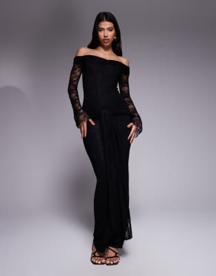 Delicate lace overlays a sleek, slim fit silhouette with a flattering off-shoulder neckline and elegant long flared sleeves. This matte black maxi dress features a tie waist and draped detail at the front, creating a sophisticated and sexy look perfect for cocktail parties, date nights, and evening events. Crafted from polyester and elastane for comfort and stretch, it offers all-weather versatility with a refined column shape and clean hemline that elevate any special occasion ensemble.