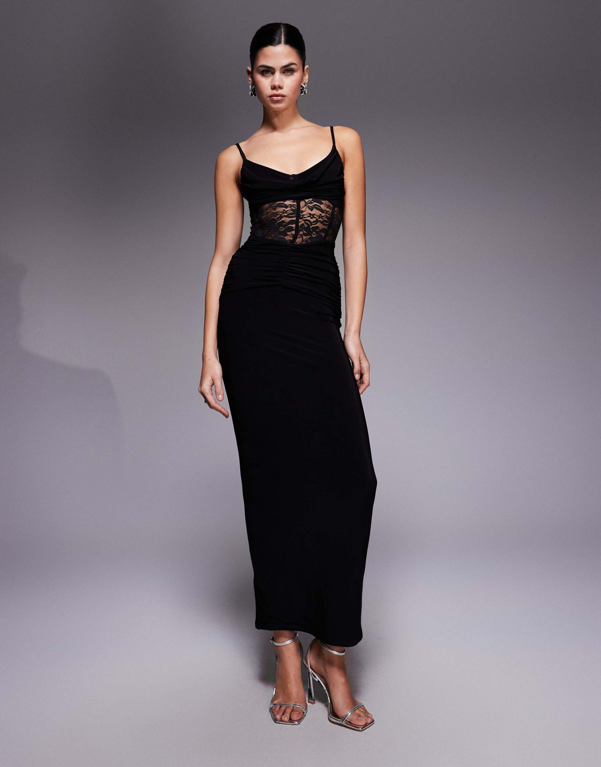 KAIIA EXCLUSIVE DOUBLE LAYERED SLINKY LACE SHEER CORSET DETAIL MAXI DRESS IN BLACK