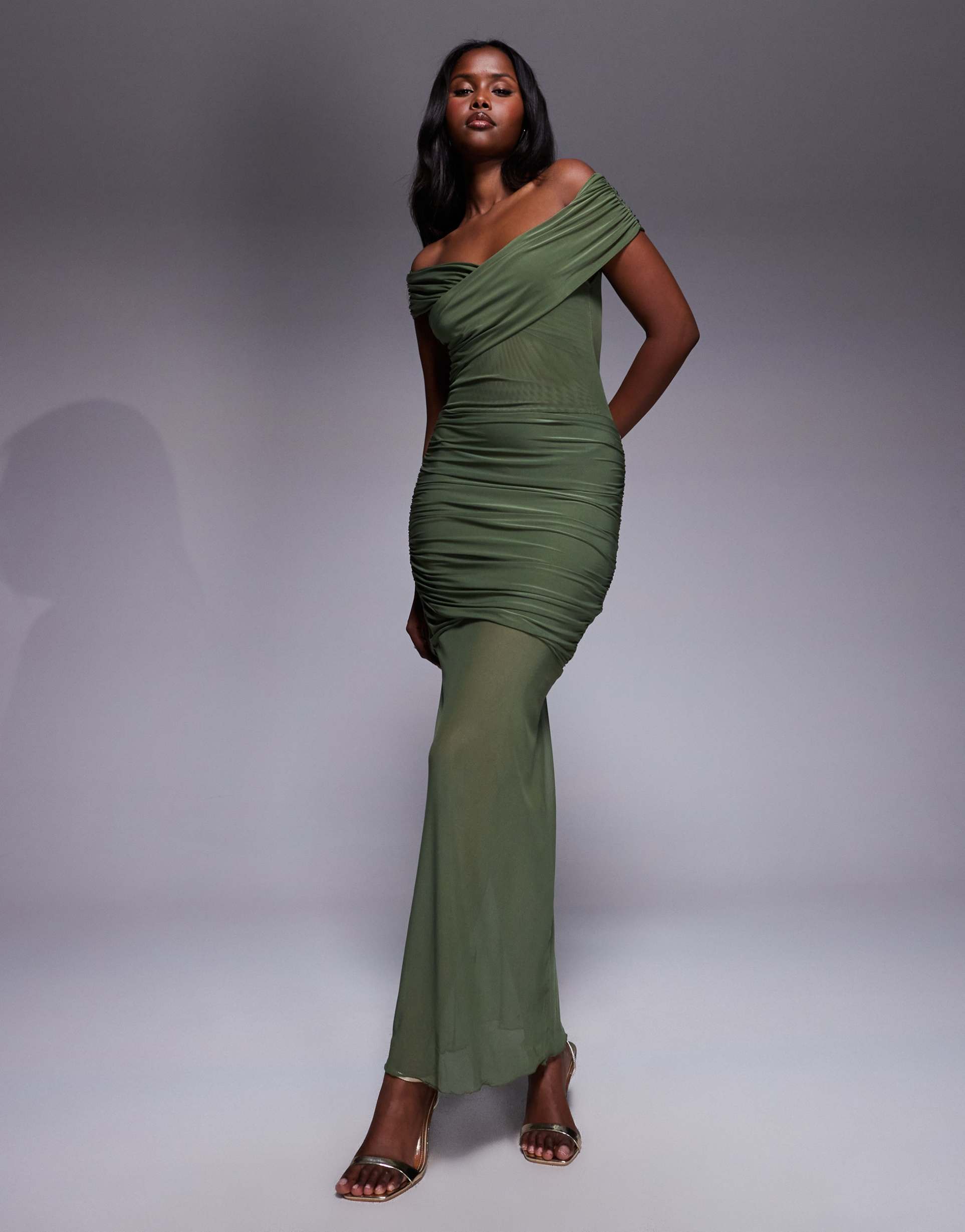 KAIIA EXCLUSIVE DOUBLE LAYERED SLINKY OFF SHOULDER SHEER MESH HEM MAXI DRESS IN OLIVE