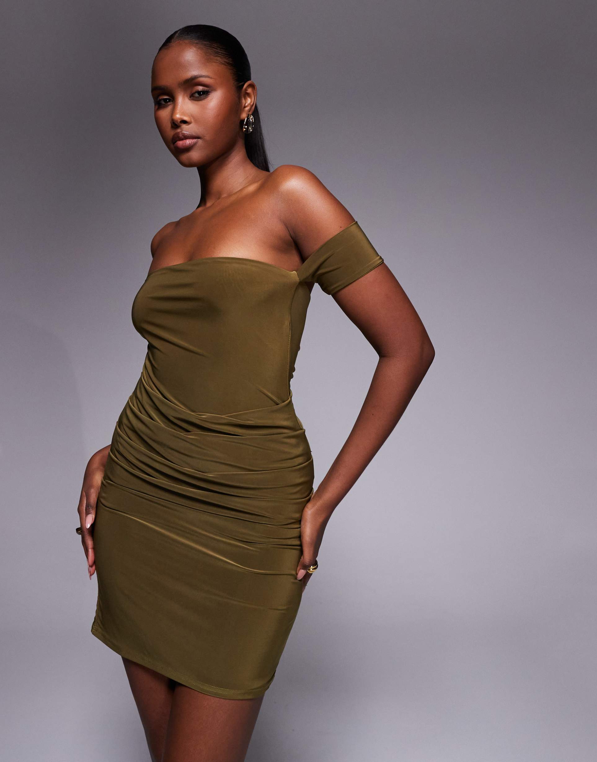 KAIIA EXCLUSIVE DOUBLE LAYERED SLINKY OFF THE SHOULDER MINI DRESS IN KHAKI GREEN