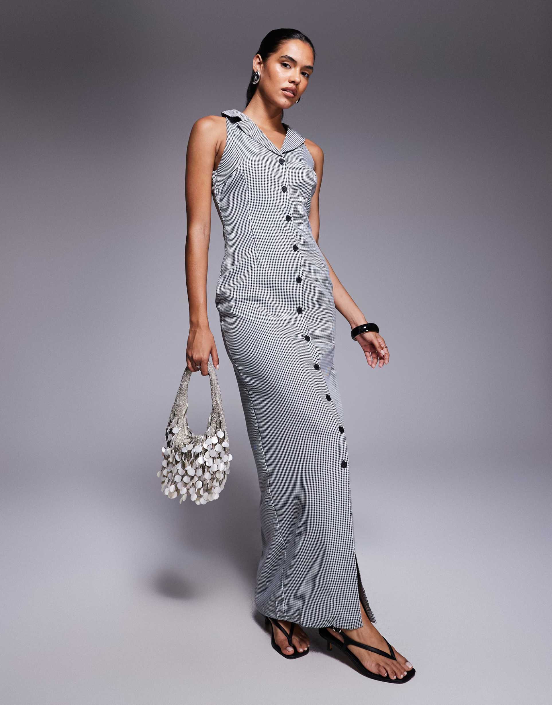 Soft polyester fabric and a flowing maxi length create a timeless silhouette with this black and white gingham slip dress. Featuring a halter neck and notch collar, the button-up front adds classic charm alongside a front slit that enhances movement. Its regular fit offers comfort and ease, perfect for casual days, brunch dates, or relaxed evening outings. The all-over gingham pattern and clean lines make it a versatile piece for spring and summer wardrobes.
