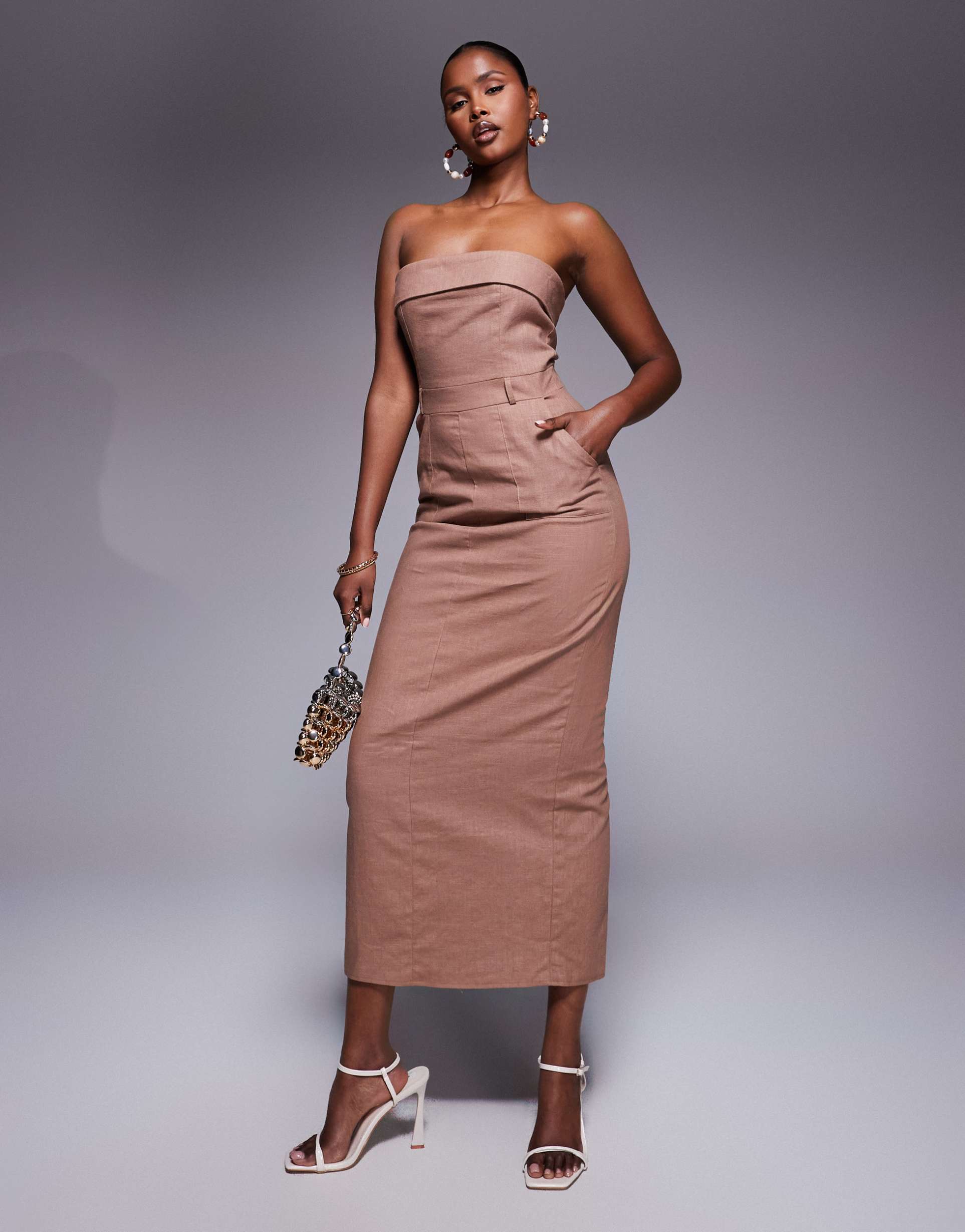 Soft matte brown linen blend shapes a tailored column silhouette with a fold-over bandeau neckline and slim fit that flatters the figure. This sleeveless maxi dress features a back zipper closure, subtle belt loops with a belt, and practical side pockets. A kick slit hemline adds ease of movement and a touch of allure. Ideal for spring and summer evenings, it suits cocktail parties, date nights, and night outs with classic minimalist elegance and breathable comfort.