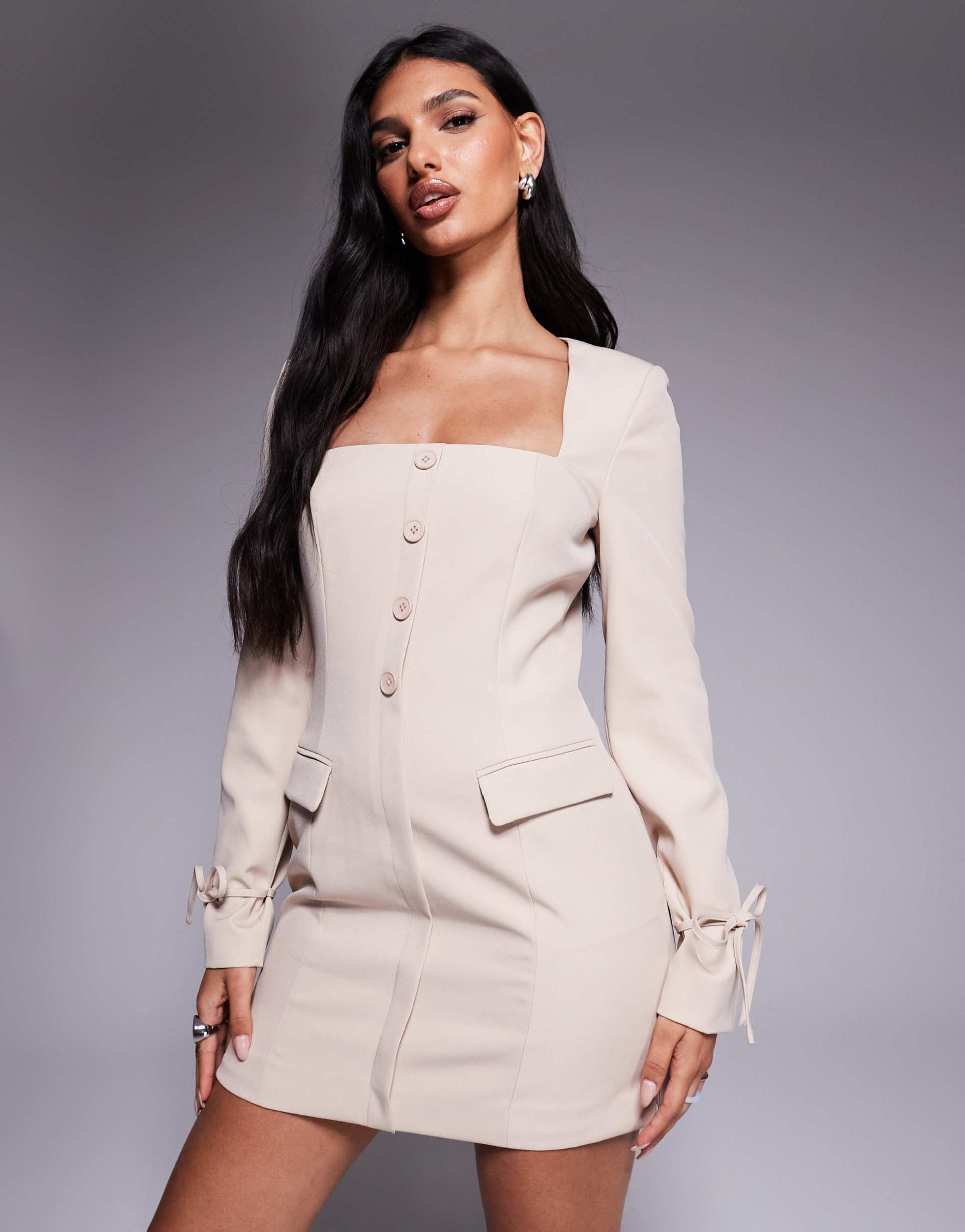 KAIIA EXCLUSIVE SQUARE NECK BOW CUFF DETAIL TAILORED BLAZER MINI DRESS IN CREAM