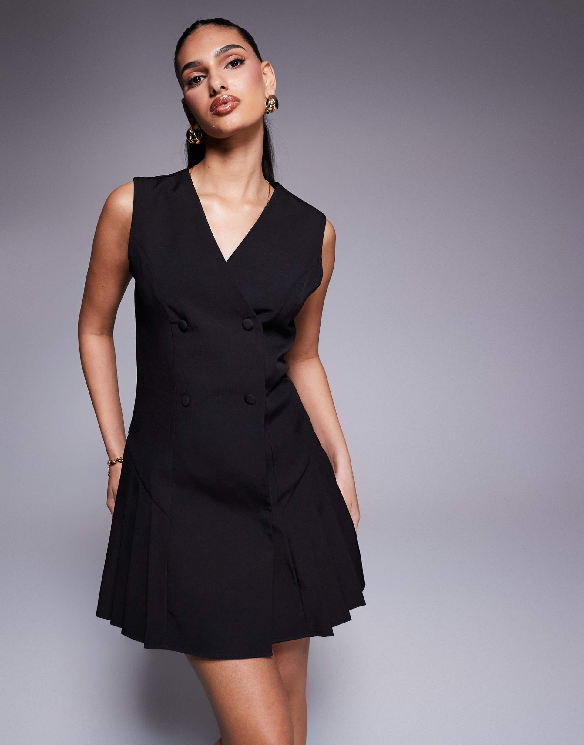 KAIIA EXCLUSIVE TAILORED SLEEVELESS BUTTON FRONT PLEAT HEM MINI DRESS IN BLACK