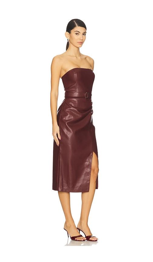 KARINA GRIMALDI SAMANTHA STRAPLESS FAUX LEATHER MIDI DRESS IN BURGUNDY.