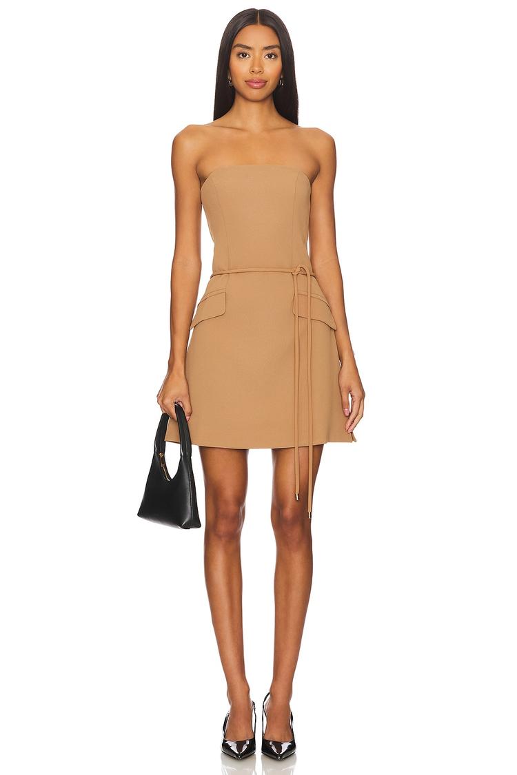 A sleek mini shift dress in a matte tan crepe fabric, tailored to a fitted silhouette that highlights the waist with an attached belt tie. The strapless straight neckline and clean hemline create a chic, modern look perfect for cocktail events, date nights, or stylish night outs. Functional front flap pockets add subtle utility, while the hidden back zipper ensures a smooth fit. Double lined for comfort, this versatile piece works beautifully across spring, summer, and autumn seasons.