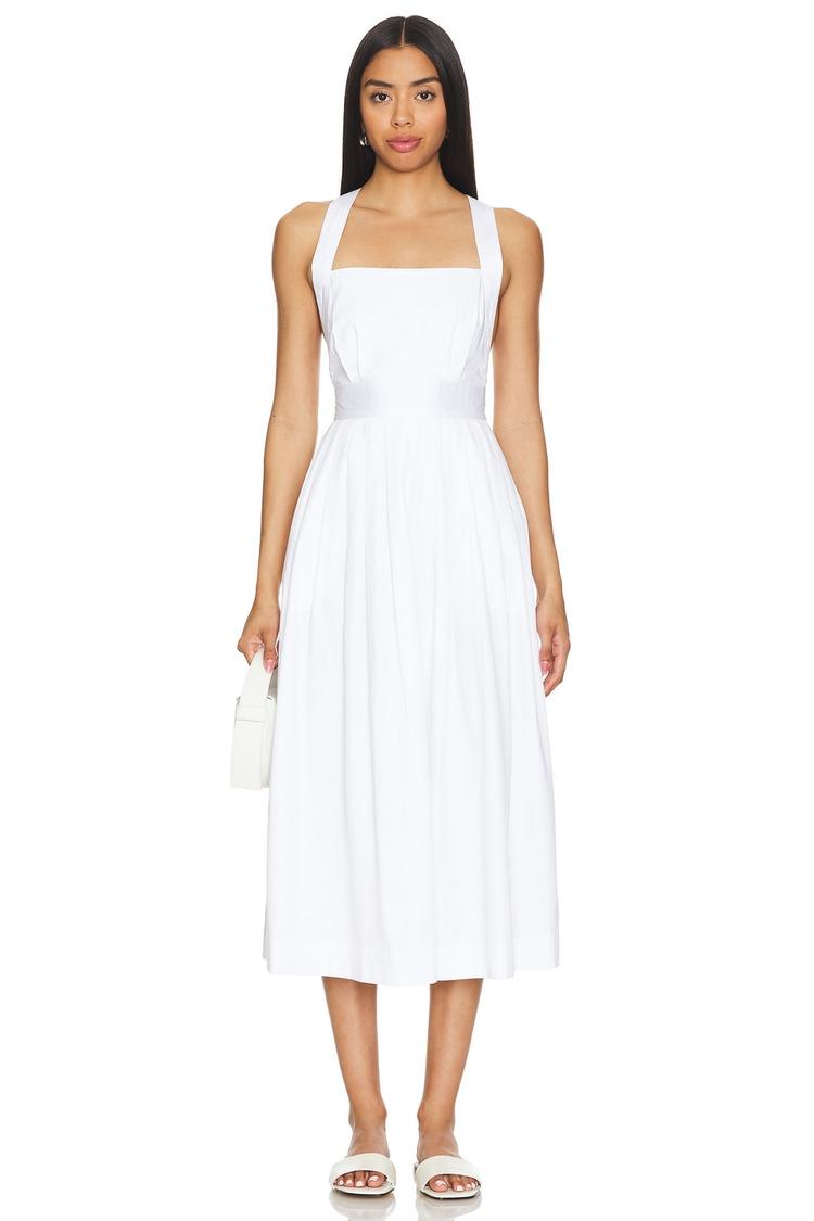Crisp white cotton poplin shapes a classic A-Line midi dress with a square neckline and wide straps that cross elegantly at the back. The concealed back zipper enhances a smooth silhouette while the regular fit offers comfortable ease through spring and summer days. Clean hemlines and minimalist design make this dress a versatile choice for casual outings, brunch dates, or relaxed evening events. Its breathable fabric and timeless cut combine effortless style with practicality, making it a staple for warm-weather wardrobes.