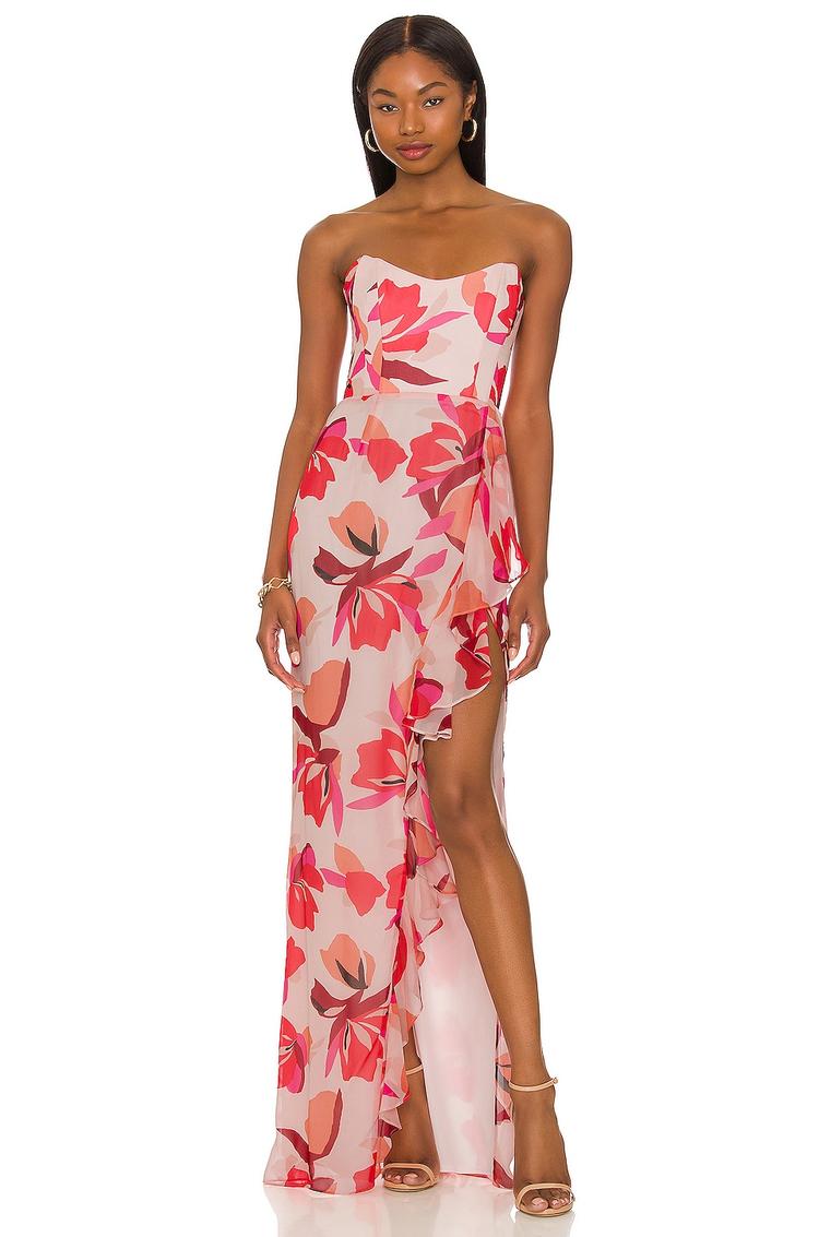 Lightweight chiffon and viscose blend fabric drape elegantly in this strapless column gown featuring a straight neckline and a fitted silhouette. The gown is adorned with a vibrant floral print in shades of pink and rose over a matte white base. Cascading ruffle trims accentuate the side slit hemline, adding movement and sophistication. Ideal for spring and summer occasions, this dress suits formal events, cocktail parties, and romantic date nights with its sleek and graceful design.