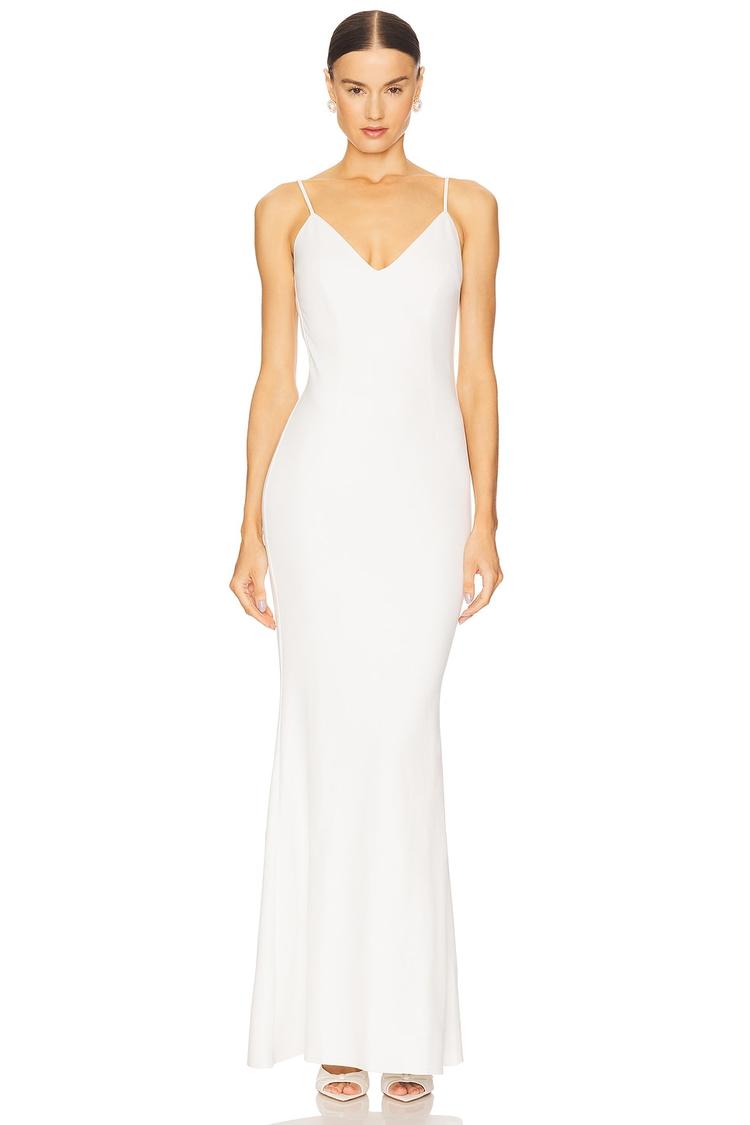 Soft crepe fabric and a sleek column silhouette combine to create an elegant maxi gown with adjustable spaghetti straps and a daring open back. The fitted cut highlights your figure, while the clean hemline adds a minimalist touch. Perfect for formal occasions, cocktail parties, and wedding guest events, this sophisticated design offers comfort with its polyester-spandex blend and hidden back zipper closure. Its timeless white hue makes it a versatile choice for any season.