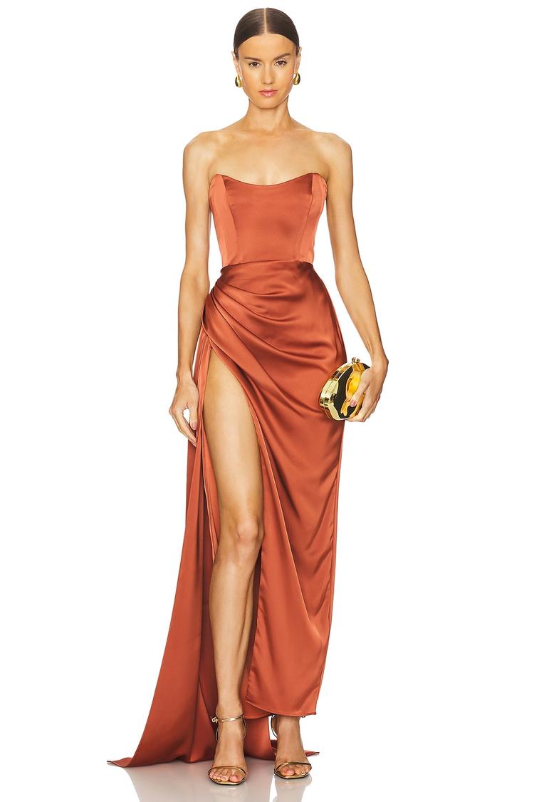 Soft satin in a rich rust hue crafts a sleek column silhouette with a fitted bodice and strapless straight neckline. The gown features elegant ruched draping at the side and a dramatic high slit that extends to a flowing maxi hem, creating movement and allure. With a concealed back zipper and boned structure, it offers a flattering, sophisticated fit perfect for formal evenings, cocktail parties, or red carpet events. Its double-lined satin fabric adds a smooth, luxe finish that shines subtly under the light.