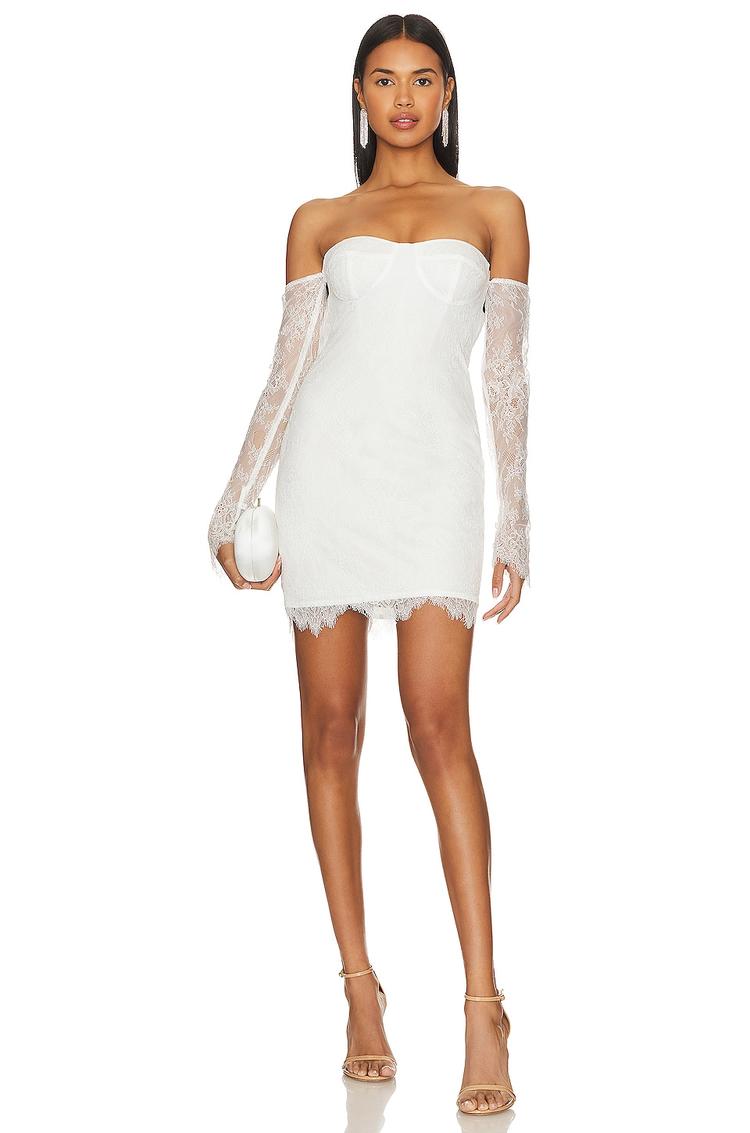 Delicate eyelash lace overlays this fitted mini sheath dress, featuring long off-shoulder sleeves that add a romantic touch. The sweetheart neckline and lightly padded underwire cups enhance the silhouette, while the open back creates a striking, sexy statement. Crafted from nylon and polyester with a fully lined boned bodice, this white dress combines elegance with modern allure. Ideal for cocktail parties, date nights, and nights out, its clean hemline and sheer lace sleeves make it a sophisticated choice for all weather occasions.