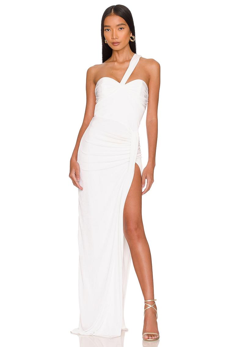 A sleek column silhouette in pristine white features a one-shoulder straight neckline and sleeveless design, creating a stunningly elegant look. The gown is crafted from a stretchy polyester and elastane blend for a fitted shape enhanced by ruched detailing on the side and a tasteful thigh-high slit. Fully lined with boned sides and a hidden back zipper, this maxi gown ensures a smooth fit perfect for cocktail parties, formal events, or gala evenings. Its clean hemline and sophisticated style make it a refined choice for upscale occasions year-round.