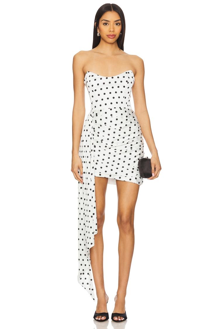 Soft charmeuse fabric and a fitted corset silhouette define this chic mini dress, featuring an asymmetric neckline and a dramatic draped side detail that adds movement and flair. The playful black polka dots on a crisp white base bring a timeless pattern to a modern party-ready piece. Its invisible back zipper and boned bodice ensure a flattering fit, while the strapless sleeveless design keeps it cool and sleek. Ideal for cocktail parties, nights out, or romantic date nights in spring and summer, this dress combines sophistication with fun.
