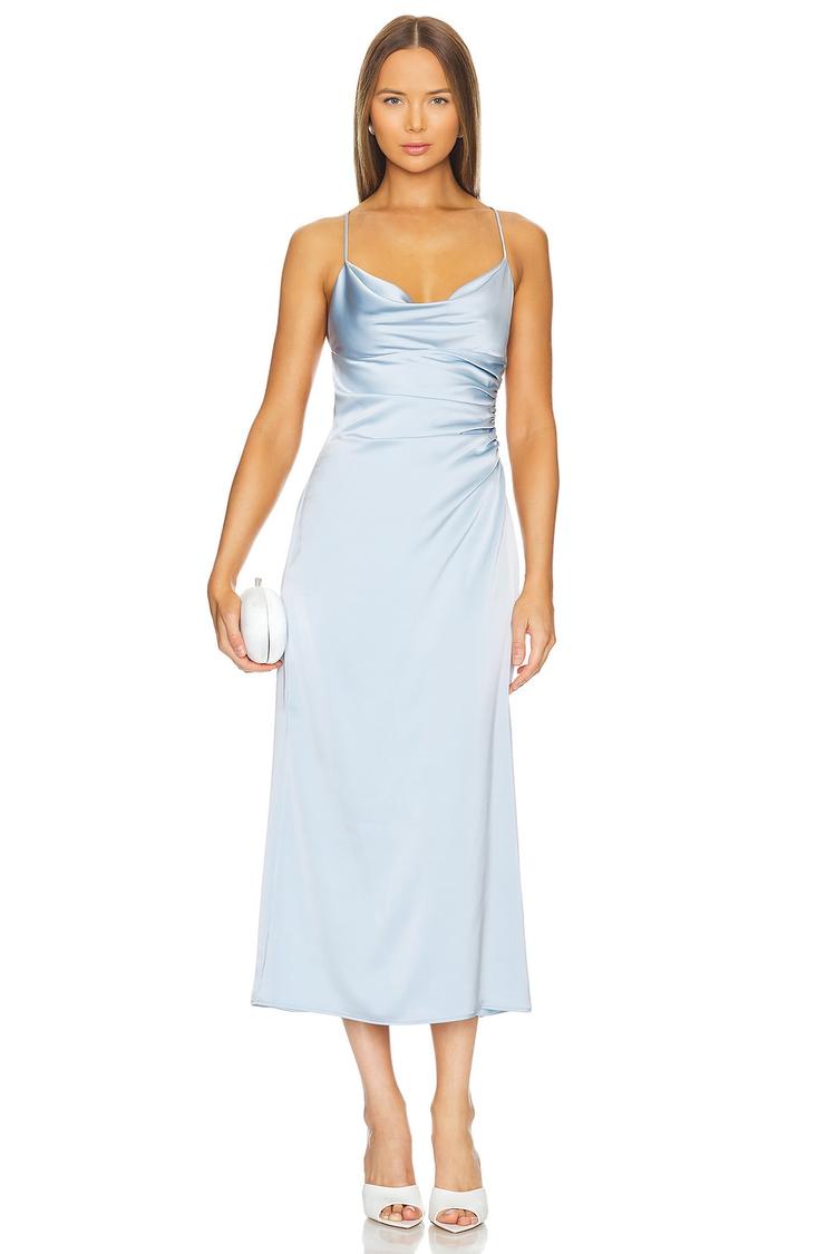 Soft matte light blue polyester forms this elegant slip dress with a flattering cowl neckline and slender spaghetti straps. The slim fit silhouette skims the body to a midi length, featuring delicate draping across the bodice and a tasteful criss-cross back design. A subtle side slit enhances movement, while the invisible side zipper ensures a sleek finish. Fully lined for comfort, this versatile dress suits cocktail parties, date nights, and upscale evenings, delivering minimalist sophistication with every wear.