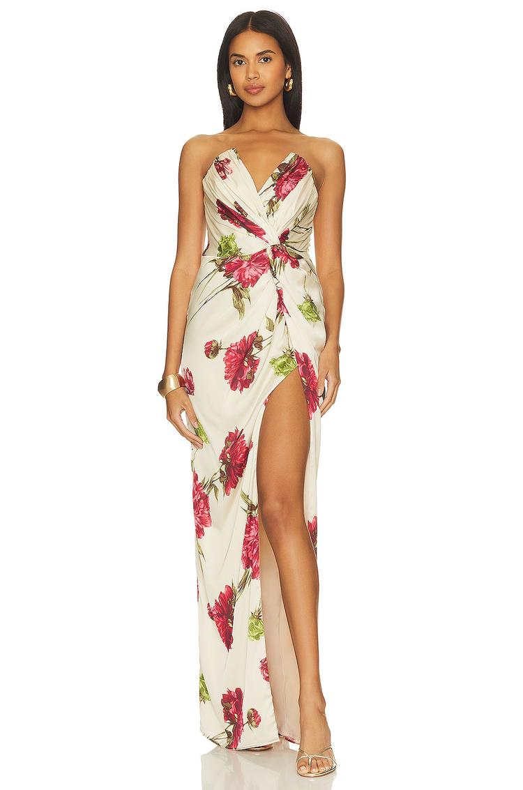 Softly ruched satin fabric shapes a figure-hugging column silhouette in this elegant maxi gown, featuring a flattering V-neckline and a daring side slit. The floral print in rich red and green tones contrasts beautifully against the ivory base, making it perfect for cocktail parties, semi-formal events, and formal occasions. A hidden back zipper and boned bodice provide structure and ease of wear, while the strapless design adds a sophisticated allure. This versatile gown delivers timeless style and refined comfort for any upscale gathering.