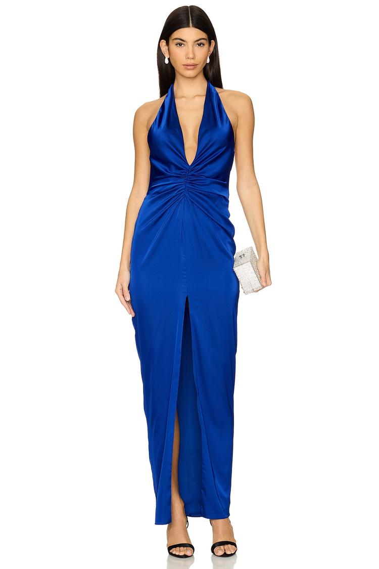 Luxurious satin fabric in a rich blue hue shapes this elegant slip dress featuring a halter neckline and a daring open back with delicate ruching at front and back. The floor-length silhouette with a front slit offers a fitted, sophisticated style perfect for formal events, cocktail parties, and glamorous night outs. Invisible zipper closure enhances the sleek look while the fully lined construction ensures comfort and smooth fit. This gown embodies timeless elegance and refined glamour for special occasions.