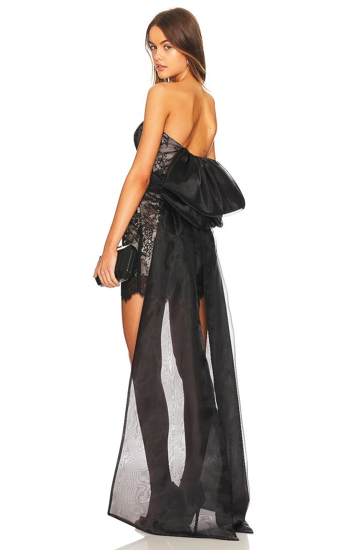 Lace-trimmed nylon and polyester blend crafts a sultry corset dress featuring a fitted silhouette and a sweetheart neckline. The strapless design highlights an underwire padded bust and a boned bodice for structured elegance. A dramatic attached train cascades from the mini length hem, perfect for cocktail parties, night outs, or romantic date nights. Concealed side zipper ensures a sleek finish, while the fully lined construction offers comfort and sophistication. This black matte dress effortlessly blends sexy and refined style for standout evening wear.