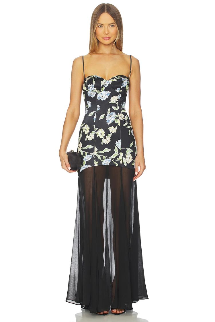A sleek satin slip dress features a fitted silhouette and a flowing maxi hem with sheer panels, accented by a delicate all-over floral print in white and light blue on a matte black base. The sweetheart neckline and adjustable spaghetti straps complement the padded underwire cups for a flattering fit. Ideal for cocktail parties, night outs, and date nights, this elegant gown blends modern sophistication with subtle romantic charm. Crafted from midweight polyester with a concealed back zipper, it offers both comfort and style for versatile all-weather wear.