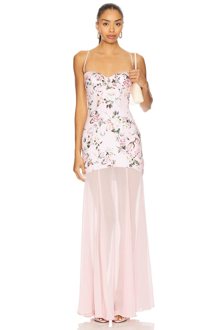 Soft pink jersey fabric paired with flowing georgette panels crafts a stunning maxi slip dress with a fitted silhouette. The sweetheart neckline and delicate spaghetti straps accentuate the shoulders, while the all-over floral print adds a romantic touch. A hidden back zipper ensures a sleek finish, perfect for formal occasions, cocktail parties, or wedding guest events during spring and summer. The sheer lower hemline creates an ethereal movement, making it an elegant and sophisticated choice for special evenings.