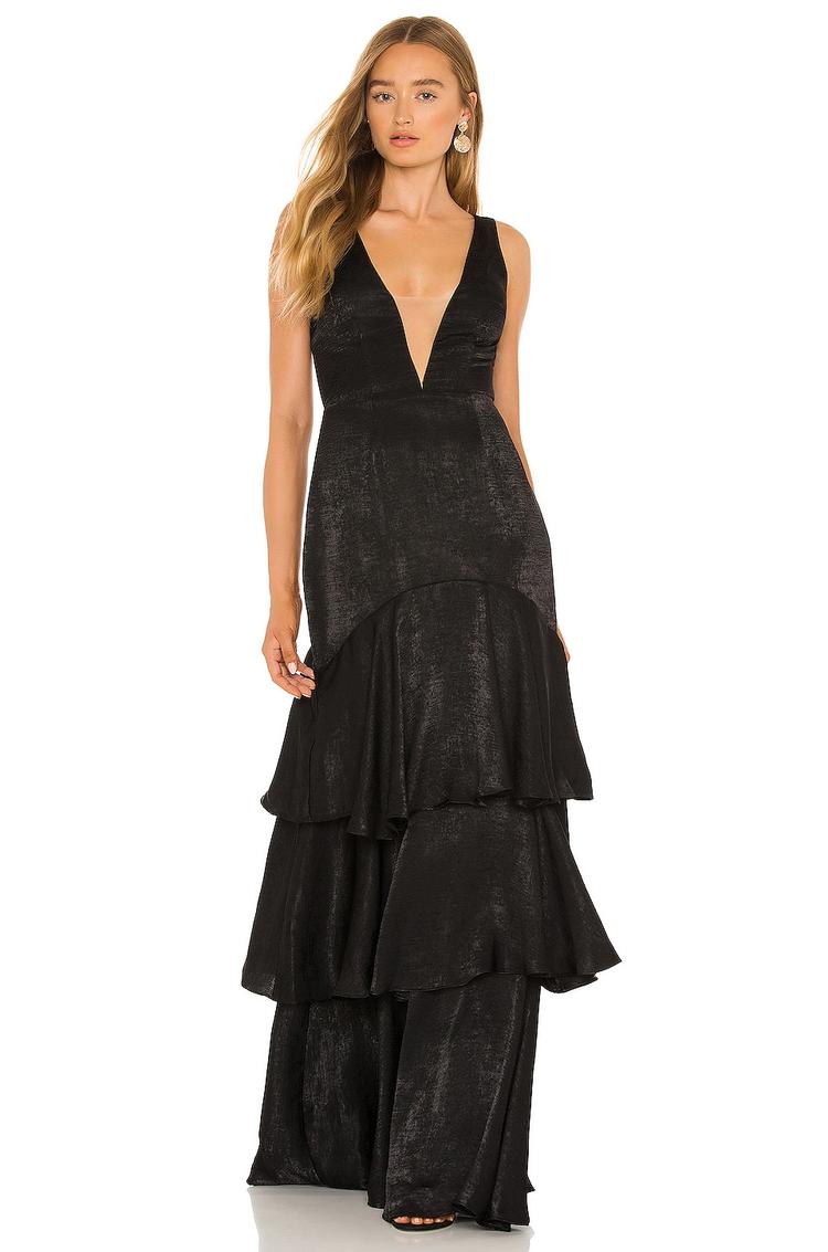 Soft satin fabric with a subtle textured sheen lends timeless elegance to this fitted column gown. The sleeveless silhouette features a daring plunge neckline with sheer mesh accents and wide straps, perfectly balancing sophistication and allure. Layered ruffle details cascade gracefully along the maxi hemline, adding movement and dimension. With a padded bust and hidden back zipper closure, it ensures a flawless fit. Ideal for formal evenings, gala events, and cocktail parties, this gown offers a chic, classic look with modern refinement.