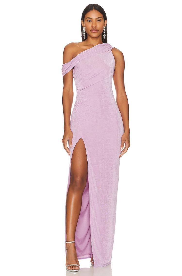 Soft matte lilac jersey fabric and a sleek column silhouette define this elegant gown. The asymmetrical neckline with wide straps and draped detailing at the front enhances its sophisticated and sexy appeal. Designed with a fitted cut and a thigh-high side slit, it offers graceful movement and a flattering fit. Fully lined with a concealed side zipper, this maxi-length dress is perfect for cocktail parties, formal events, or a stylish night out. Its versatile and refined style makes it a standout piece for various special occasions.