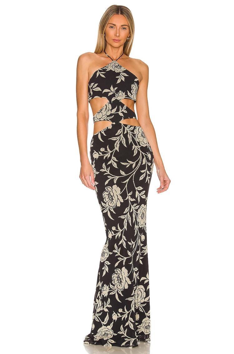 Delicate floral patterns in off-white contrast beautifully against the matte black nylon fabric, creating a striking column silhouette with a maxi length. The halter neck and sleeveless design, combined with front and back cut-outs, offer a slim fit that exudes elegance and sophistication. Perfect for formal events, cocktail parties, and night outs, this fully lined gown features a tie-back closure and hook fastening for a secure fit. Its versatile style seamlessly transitions from spring to autumn occasions, making it a timeless and sexy addition to your wardrobe.