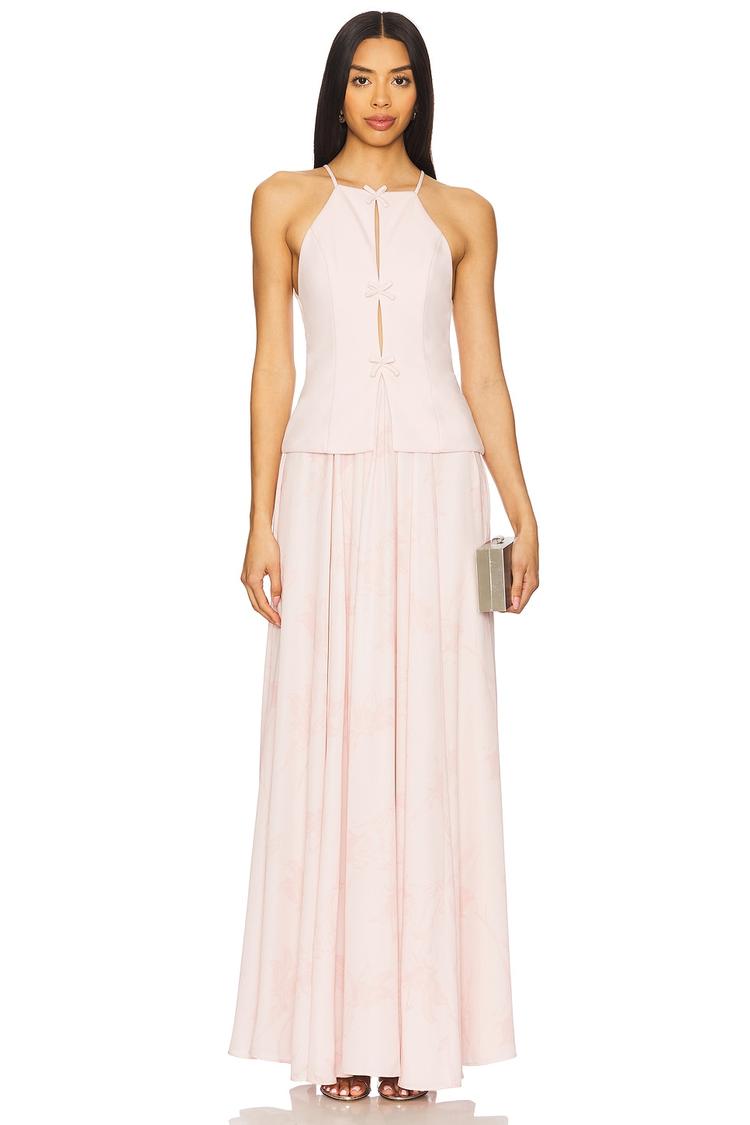 Soft crepe fabric in a matte blush hue forms the basis of this elegant column gown. The fitted silhouette flows into a maxi length with a clean hemline, while a halter neckline and sleeveless cut highlight the shoulders. Front bow accents add a delicate touch to the cut-out bodice, complemented by subtle floral details on the skirt. Ideal for cocktail parties, formal events, and wedding guest attire, this gown offers sophistication and grace with a comfortable polyester-spandex blend.