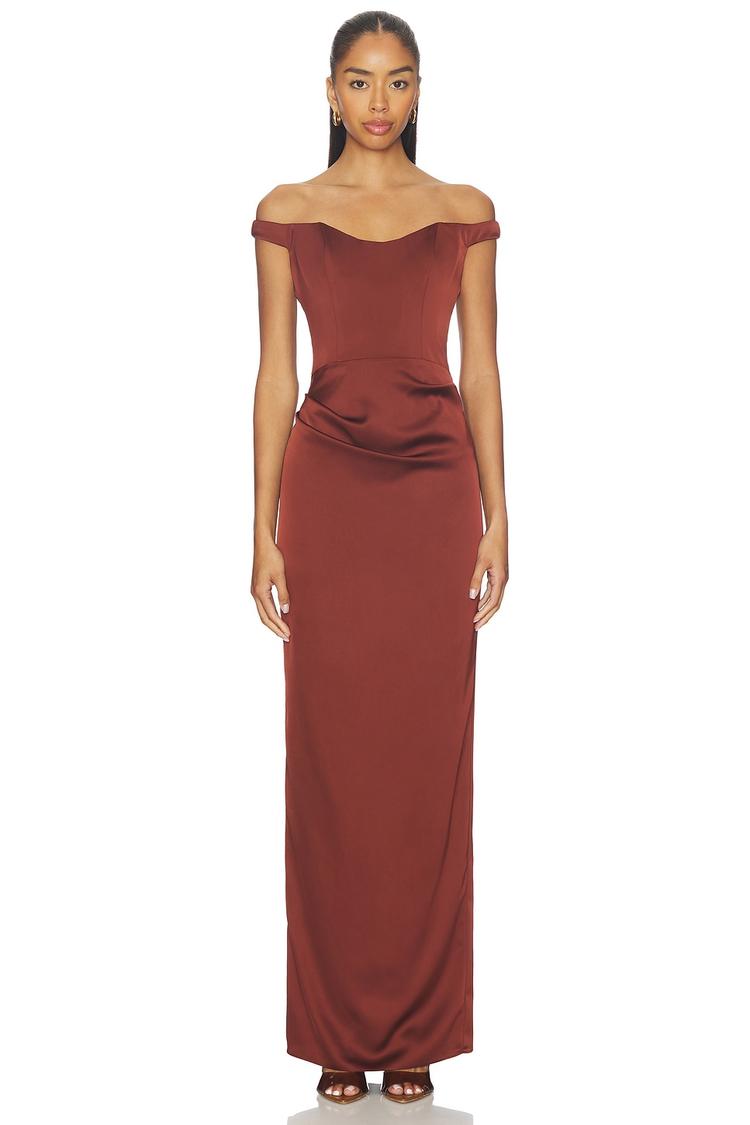 Soft matte brown satin fabric and a sleek column silhouette create a timeless elegance in this strapless gown. Featuring an off-shoulder neckline with nonstick silicone grip trim, the fitted bodice flows gracefully into a maxi-length hem with a clean finish. Concealed back zipper and hook-and-eye closure ensure a seamless look. Perfectly suited for formal events, cocktail parties, and wedding guest occasions, this polyester gown offers sophisticated style and comfort across all seasons.
