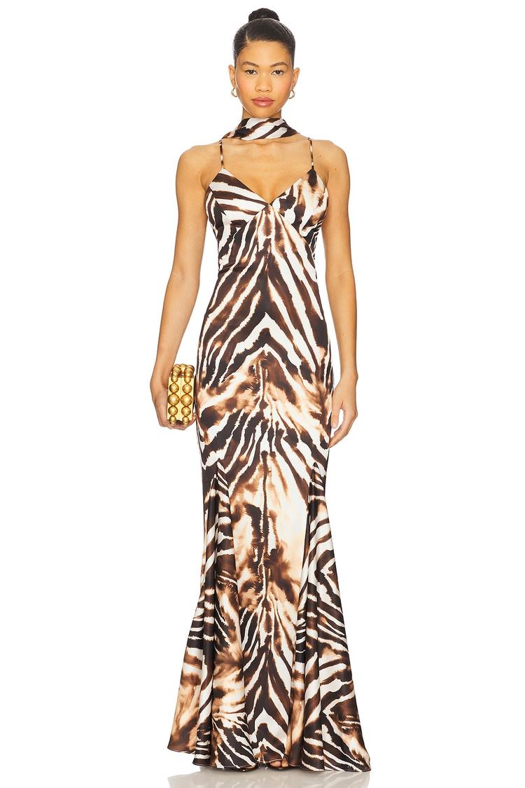 A striking abstract print in matte black, beige, and brown flows across a sleek column silhouette with a fitted bodice and a flattering V-neckline. The maxi-length gown features a sleeveless style and a clean hemline, crafted from midweight sateen polyester for subtle sheen and structure. A hidden back zipper ensures a smooth fit, while the detachable scarf adds versatile styling options. Ideal for cocktail parties, formal events, and wedding guest occasions, this sophisticated gown embodies modern elegance and effortless glamour.