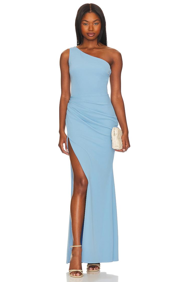 Soft matte light blue jersey fabric sculpts a fitted column silhouette with a sophisticated one-shoulder neckline and sleeveless styling. The gown’s clean maxi hem and daring side slit add alluring movement and modern elegance. Fully lined with a concealed side zipper closure, this versatile dress suits cocktail parties, formal evenings, and night outs with refined grace and comfort.