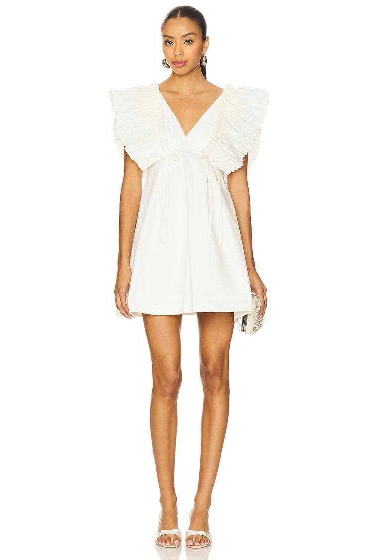 Lightweight yet structured, this white A-Line mini dress features pleated ruffled shoulder straps and elegant bow accents at both front and back, crafted in heavyweight poplin fabric. Its sleeveless design and V-neckline create a flattering silhouette with a concealed back zipper for a clean finish. Ideal for spring and summer occasions, it suits brunches, cocktail parties, and date nights with effortless sophistication and classic charm.
