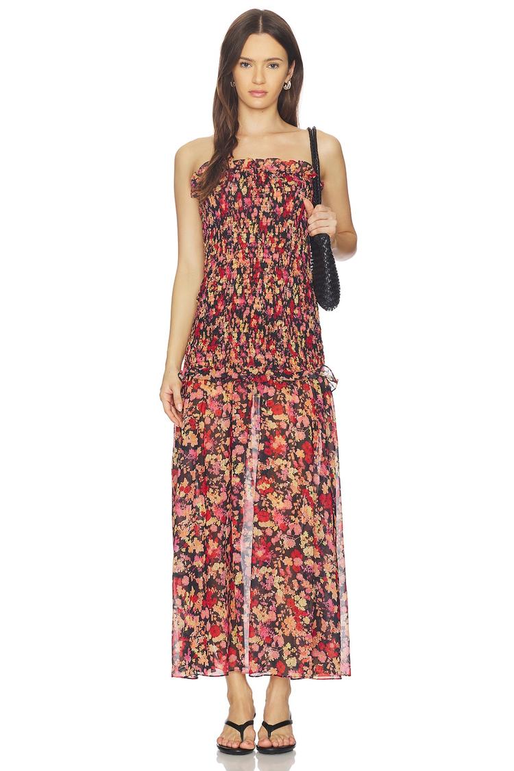Lightweight chiffon and a breezy shift silhouette create a relaxed yet stylish vibe in this midi-length strapless dress. Featuring an elasticized neckline and delicate ruffles on the bodice and skirt, the floral print bursts with red, pink, and orange hues for a vibrant summer look. Perfect for casual brunches, beach vacations, or warm spring days, its loose fit and semi-sheer fabric offer comfort and effortless charm. Slip-on styling adds ease for on-the-go wear, making it a versatile addition to your warm-weather wardrobe.