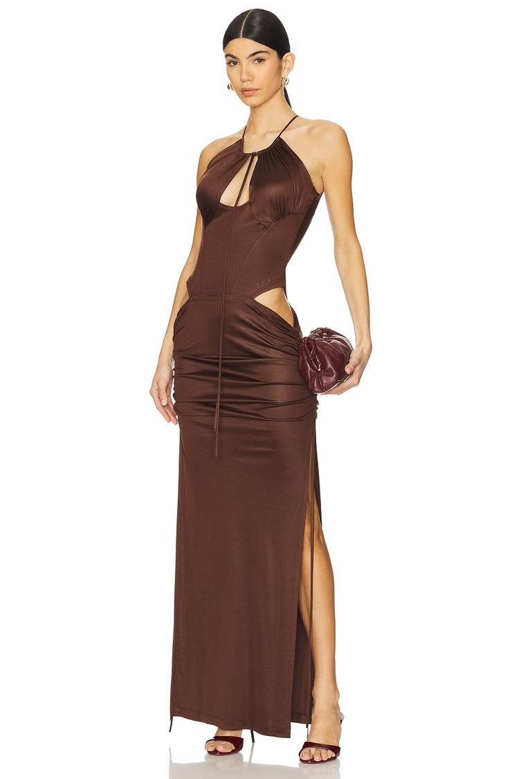 A sleek matte brown column silhouette with a daring keyhole neckline and sleeveless design creates a modern, sexy look. The floor-length maxi hem features a bold side slit, while adjustable ties at the sides introduce ruching for a customized slim fit. Crafted from a midweight acetate and polyamide jersey fabric, this dress enhances your figure with front and side cut-outs that add an edgy touch. Ideal for cocktail parties, night outs, and intimate date nights, it blends trend-forward style with wearability across spring, summer, and autumn seasons.
