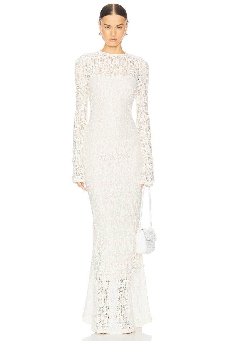 Soft sheer lace with a subtly flounced hem creates an elegant silhouette in this column maxi dress. The fitted shape and long sleeves combine with a classic round neckline for a sophisticated look, while the detachable slip lining adds comfort and versatility. Ideal for cocktail parties, formal events, and wedding guest attire, this dress blends refined style with delicate detailing. Crafted from a modal, nylon, elastane, and polyester blend, it offers a smooth drape and slight stretch that enhances its flattering fit. The hidden back zipper keeps the lines clean and polished.