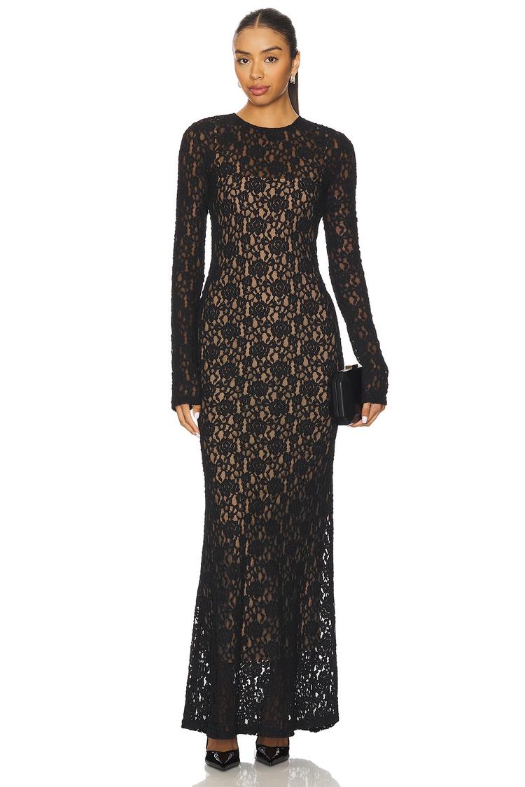 Intricate black lace overlay adds a timeless elegance to this fitted column maxi dress, featuring long sleeves and a modest round neckline. The concealed back zipper ensures a sleek silhouette while the clean hemline finishes the look. Crafted from a delicate blend of polyester, cotton, and nylon, it offers both comfort and sophistication. Ideal for cocktail evenings, date nights, or upscale night outs, this dress embodies classic sophistication with modern ease.