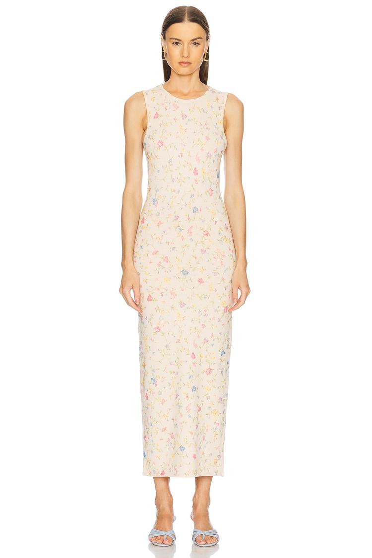 Soft midweight knit fabric in a creamy base sets the tone for this fitted sheath dress featuring delicate all-over floral prints in dusty pink, blue, and green hues. The sleeveless design with wide straps and a classic round neckline creates an elegant yet approachable silhouette, perfect for transitional seasons like autumn and spring. Its midi length and pull-on styling offer comfort and versatility for casual outings, brunches, or date nights. The blend of cotton and wool ensures warmth without sacrificing breathability, making this a timeless addition to a minimalist and classic wardrobe.