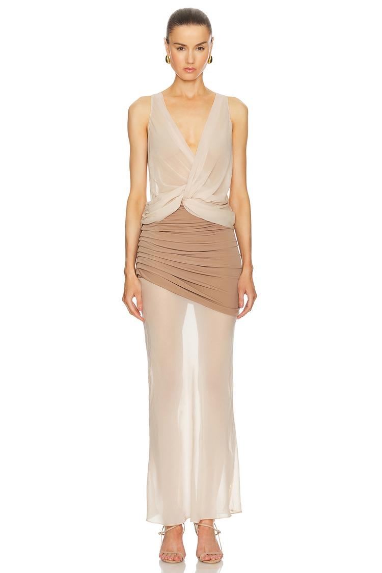 Soft matte beige and brown hues blend seamlessly in this elegant column midi dress featuring a slim fit and a flattering V-neckline. The sleeveless design with wide straps highlights the shoulders, while ruching on the brown skirt adds texture and visual interest. Crafted from lightweight polyester and elastane with semi sheer panels, it offers a modern, sophisticated look perfect for spring and summer evenings. A hidden side zipper ensures a smooth silhouette, making it an ideal choice for date nights, cocktail parties, or night outs where understated glamour is key.